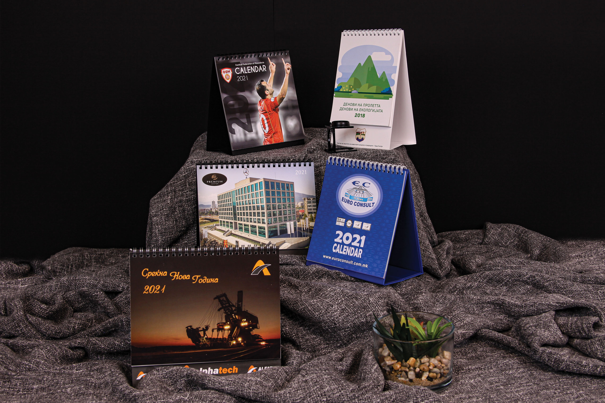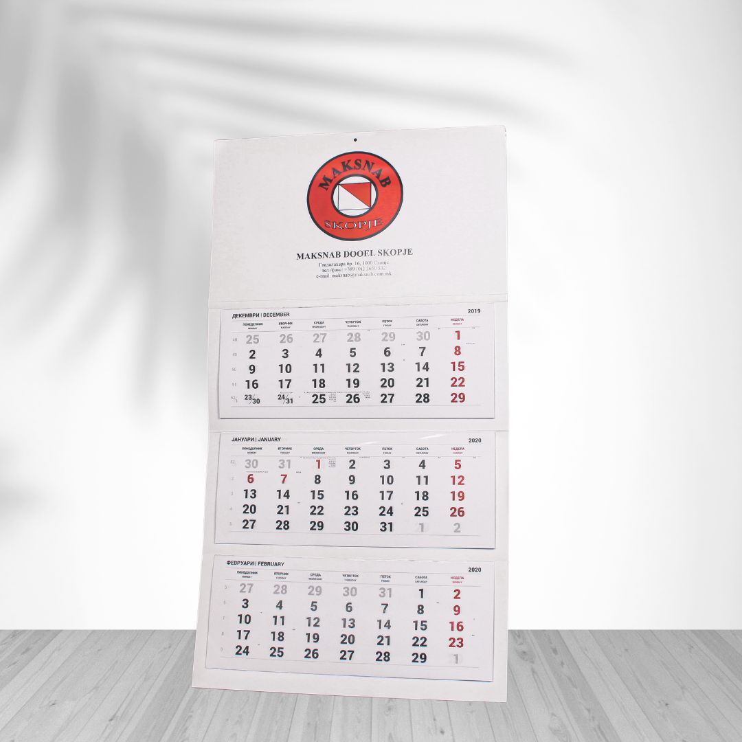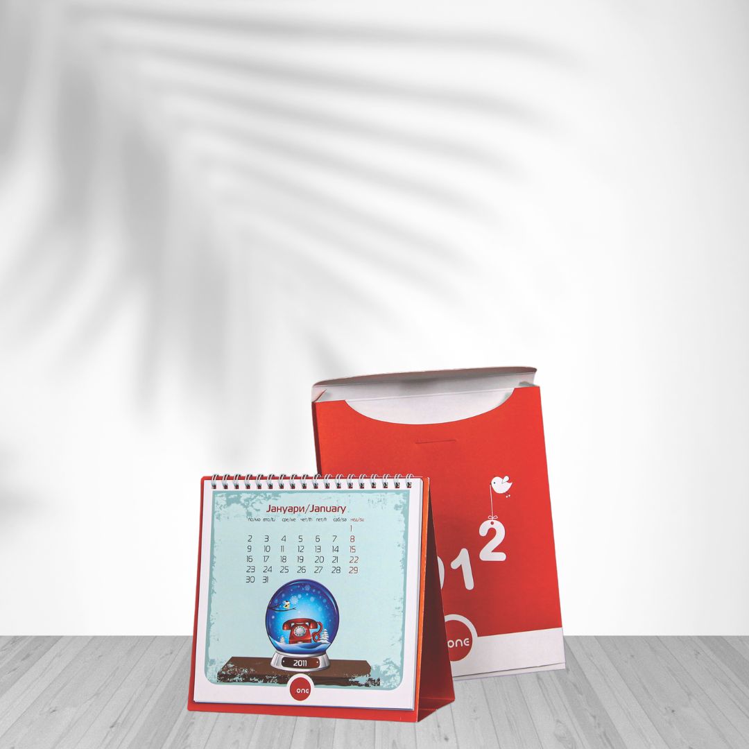 Нашиот тим нуди целосна поддршка – од идејно решение и графички дизајн до завршна подготовка за печат. Можете да изберете од различни типови и формати на календари, прилагодени на вашиот бренд, со можност за вклучување на вашето лого, бои, фотографии и пораки.